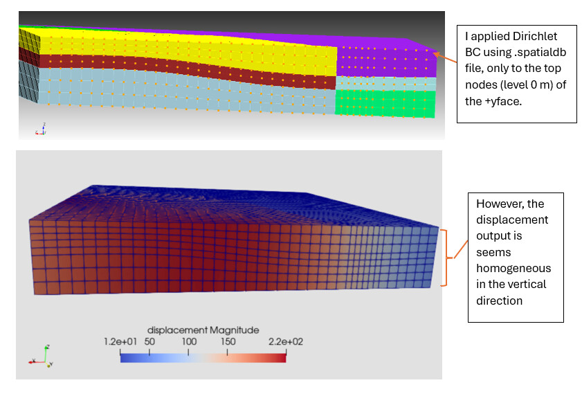 I have a set of nodes located on the +Y face. I applied a Dirichlet boundary condition only to the top layer (top nodes) of the +Y face using SimpleGridDB. However, after running the model and examining the results, I observed that all nodes on the +Y face appeared to move consistently, as if the Dirichlet boundary condition had been applied to the entire surface (all nodes).