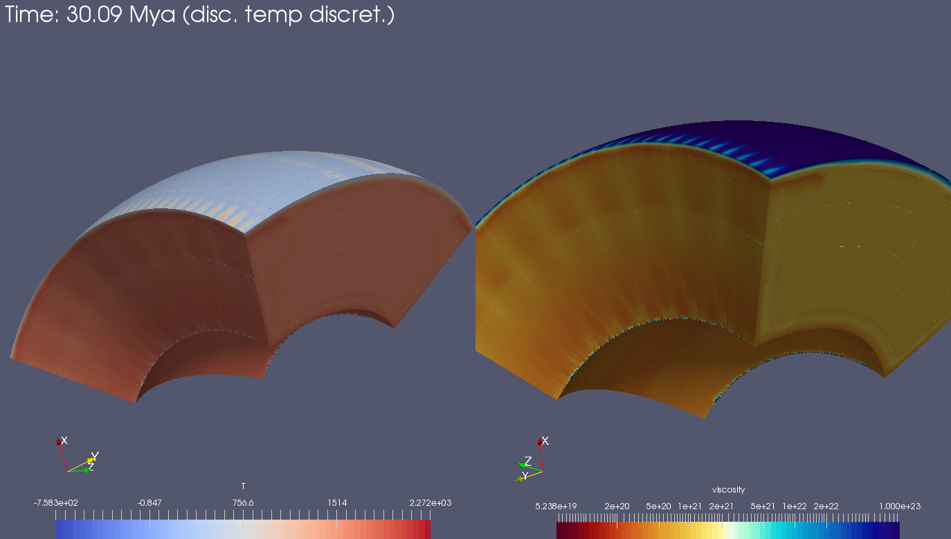 I’ve been experiencing issues in the temperature field while using 3D spherical geometries (both the 3D chunk and 3D spherical shell). I’m using a temperature dependent viscosity from the simple material model in a fairly simple mantle convection set up. The two issues are that even though I have the outer and inner boundaries set to prescribed temps (273 and 2000K respectively) the min and max temperatures will exceed those bounds reaching negative temps and some several hundred degrees higher, and I am seeing oscillations in both the temperature and viscosity in visualizations.
